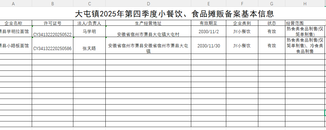 萧县大屯镇2025年第四季度小餐饮、食品摊贩备案基本信息