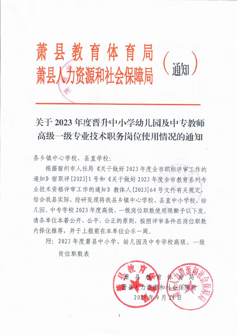 【评审通知】关于2023年度晋升中小学幼儿园及中专教师高级一级专业技术职务岗位使用情况的通知