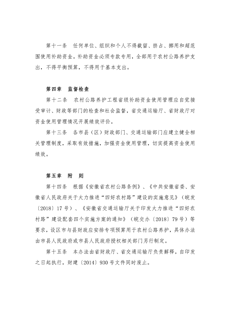 【农村公路补助政策信息】安徽省财政厅安徽省交通运输厅关于印发《安徽省农村公路养护工程省级补助资金管理办法》的通知