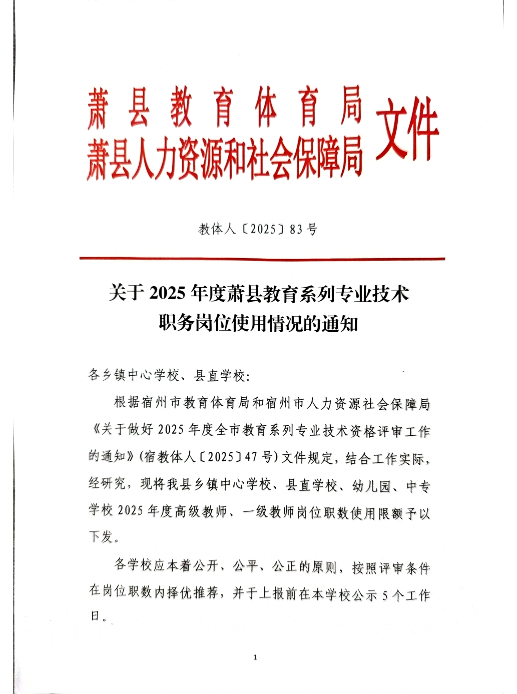 【评审通知】关于2025年度萧县教育系列专业技术职务岗位使用情况的通知