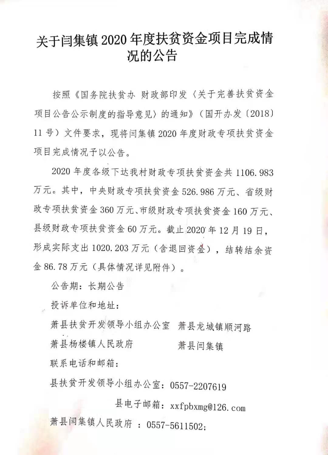 关于闫集镇2020年度扶贫资金项目完成情况的公告