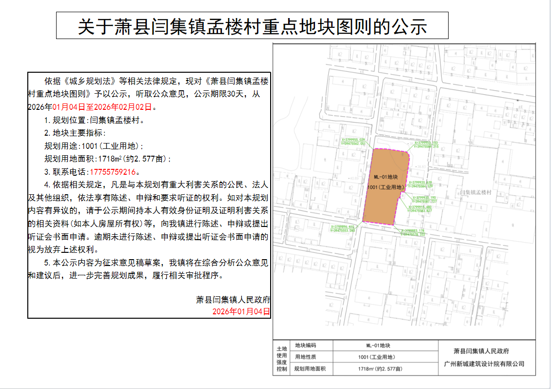 关于萧县闫集镇孟楼村重点地块图则的公示