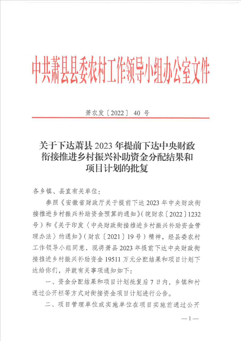 关于下达萧县2023年提前下达中央财政衔接推进乡村振兴补助资金项目的批复