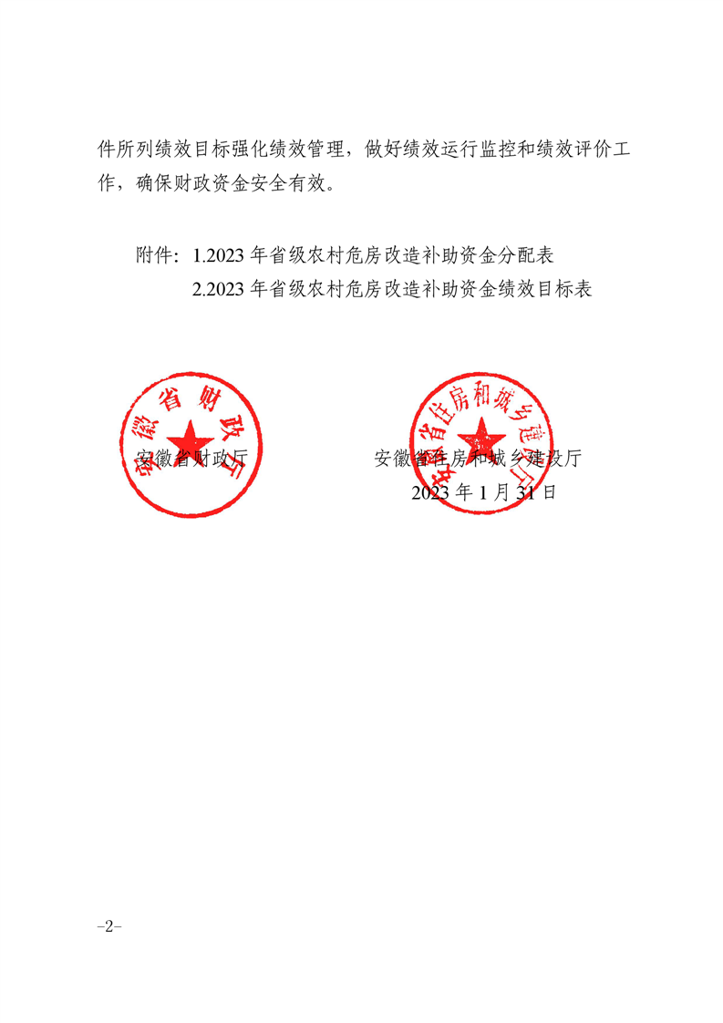 安徽省财政厅安徽省住房和城乡建设厅关于下达2023年省级农村危房改造补助资金的通知
