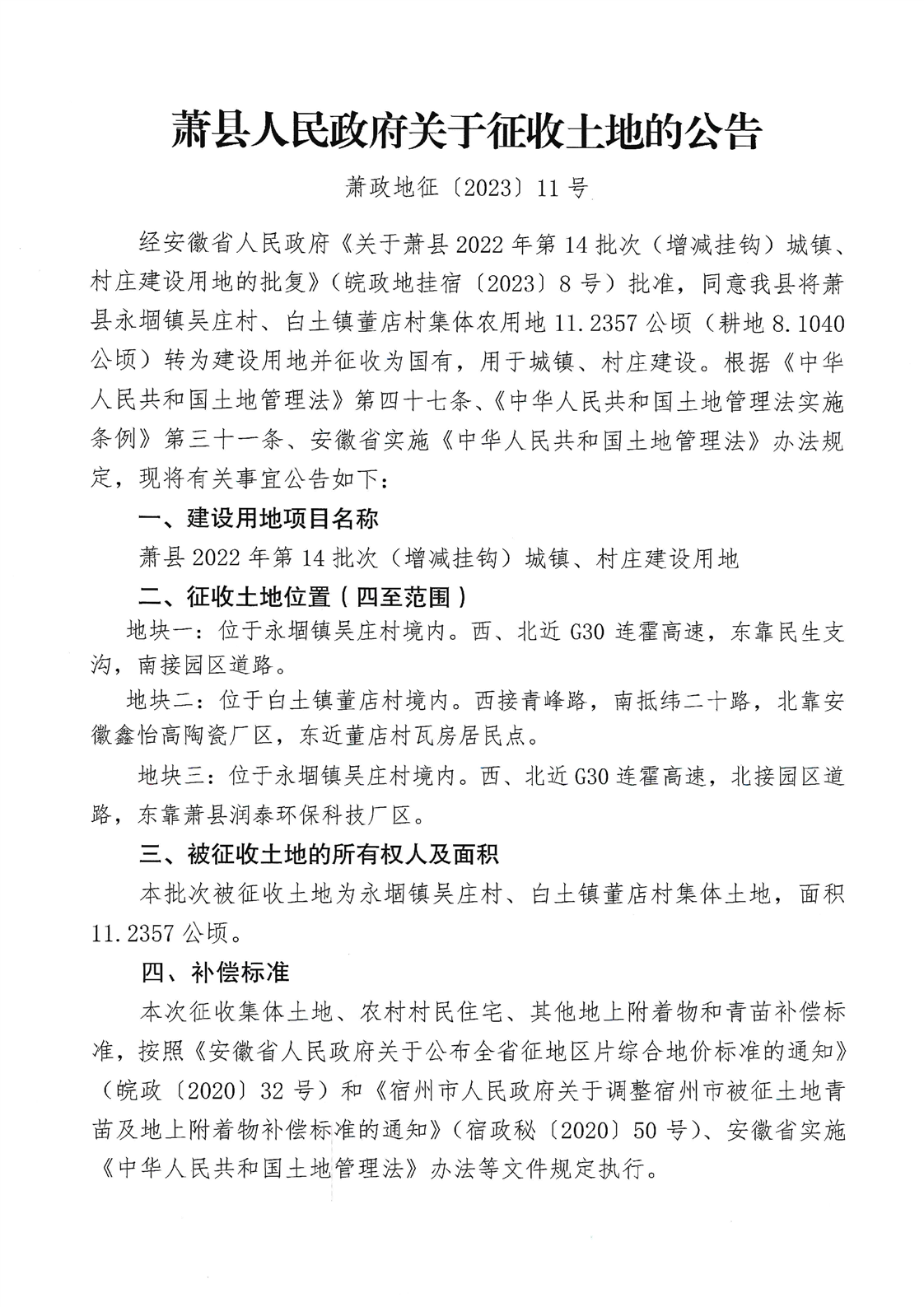 萧县人民政府关于征收土地的公告萧政地征(2023)11号(永堌镇吴庄村)
