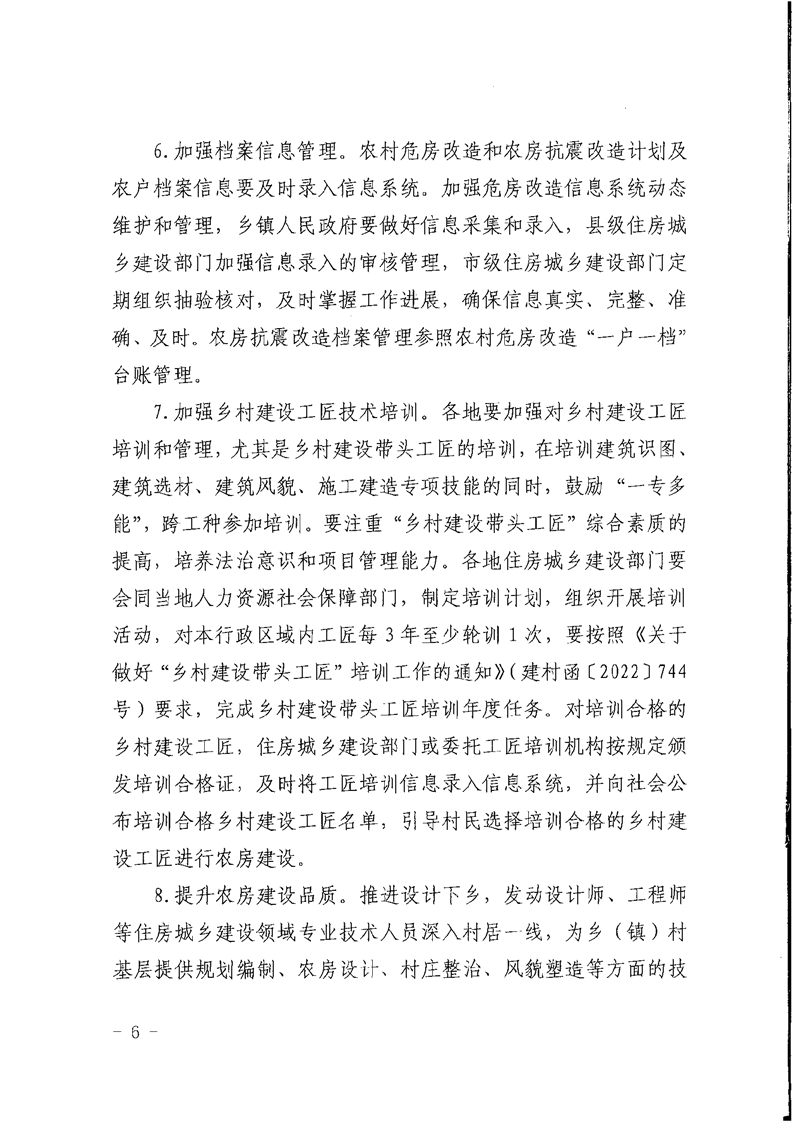 1.全面摸底排查。持续实施农房安全动态管理,加强摸底排查,做到应排尽排,对排查出符合条件的,及时纳入改造计划。特别是农房抗震改造,我市全部是抗震设防烈度7度以上地区,泗县还是8度抗震设防烈度地区,各县区要按照安徽省住房和城乡建设厅《关于做好农房抗震改造工作的通知》(建村函〔2023〕31号)要求,做到应纳尽纳、应改尽改,做好我市抗震设防7度及以上地区农村低收入群体房屋抗震改造工作,全面保障住房安全。