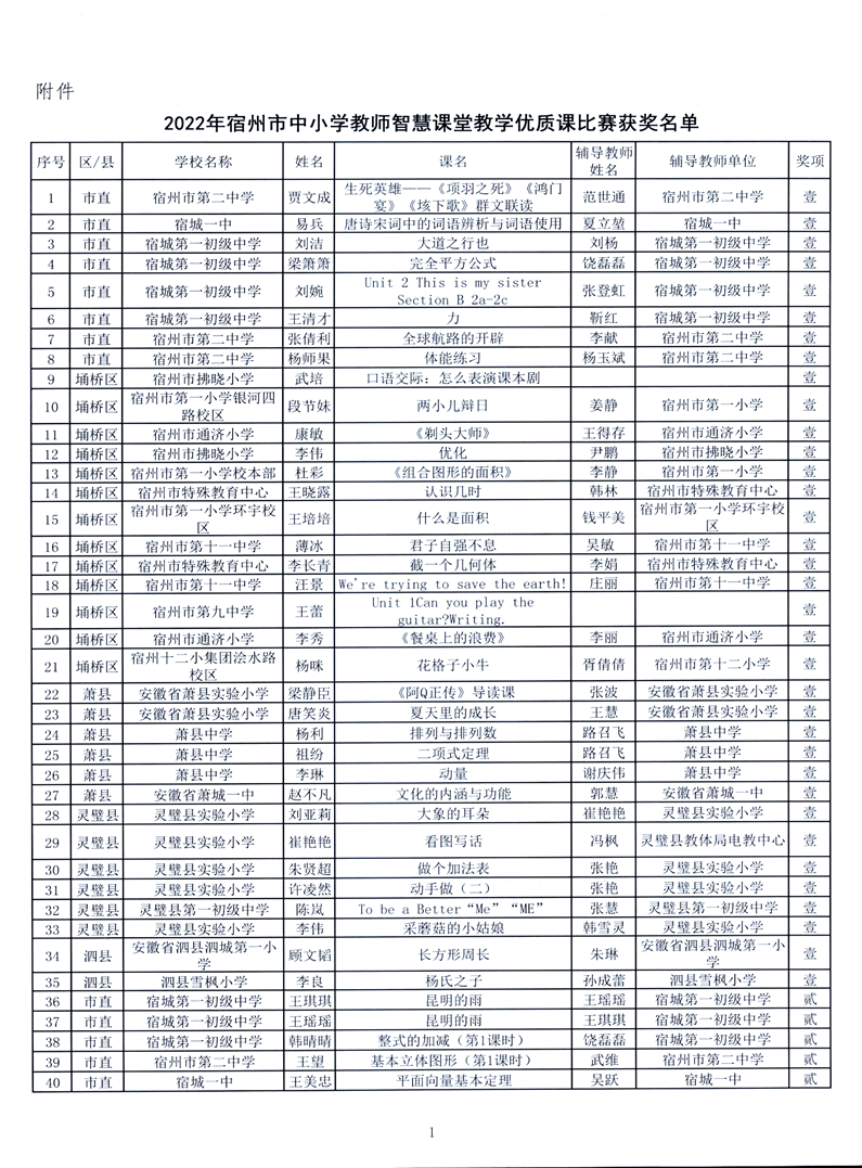 关于公布2022年宿州市中小学教师智慧课堂教学优质课比赛获奖名单的通知