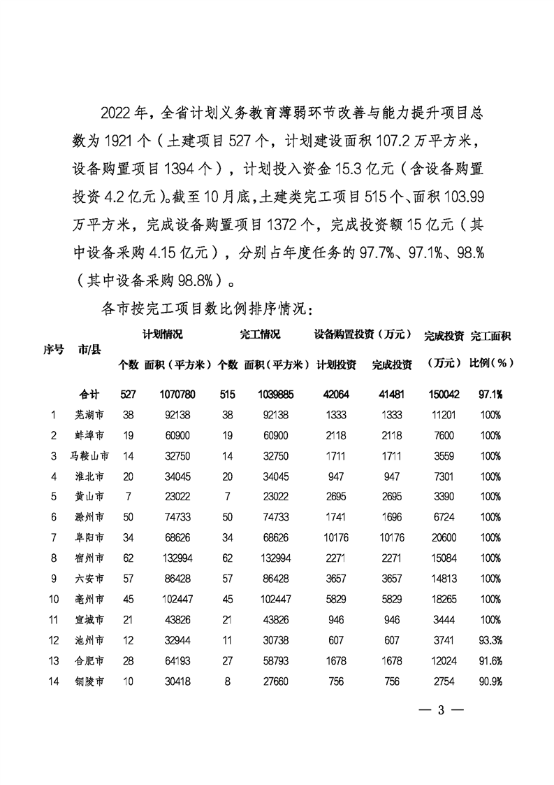 安徽省教育厅关于基础教育项目建设及学生营养改善计划等截至10月底进展的简要情况