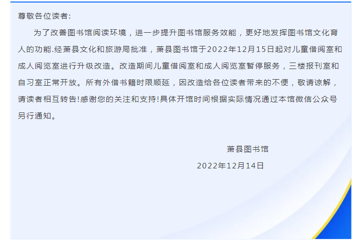 重要通知|萧县图书馆关于升级改造暂停部分服务的通知