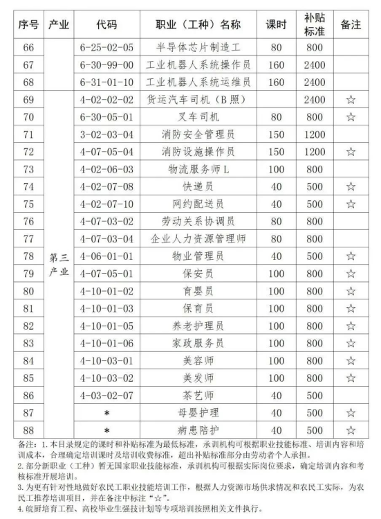 育婴员、保育员、家政服务员、养老护理员、保健按摩师、中式烹调师、中式面点师、保育员、直播销售员、母婴护理员、病患陪护员、徽菜师傅 |