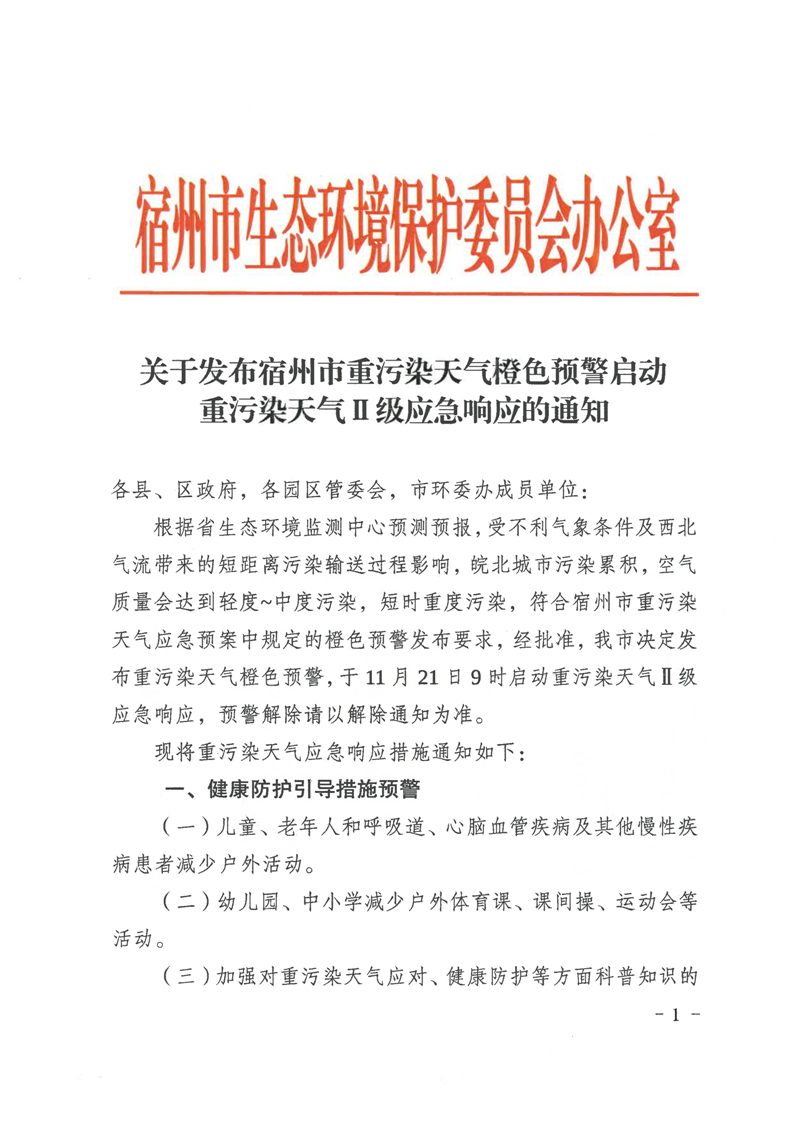 关于发布宿州市重污染天气橙色预警启动重污染天气Ⅱ级应急响应的通知