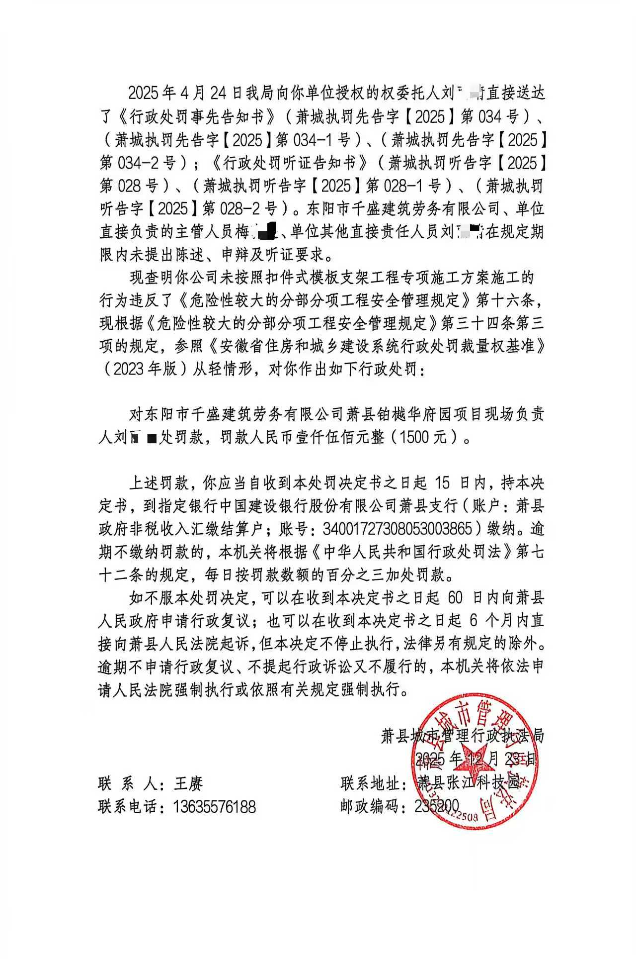 萧县城市管理局2025年工程建设管理行政处罚公示(八)