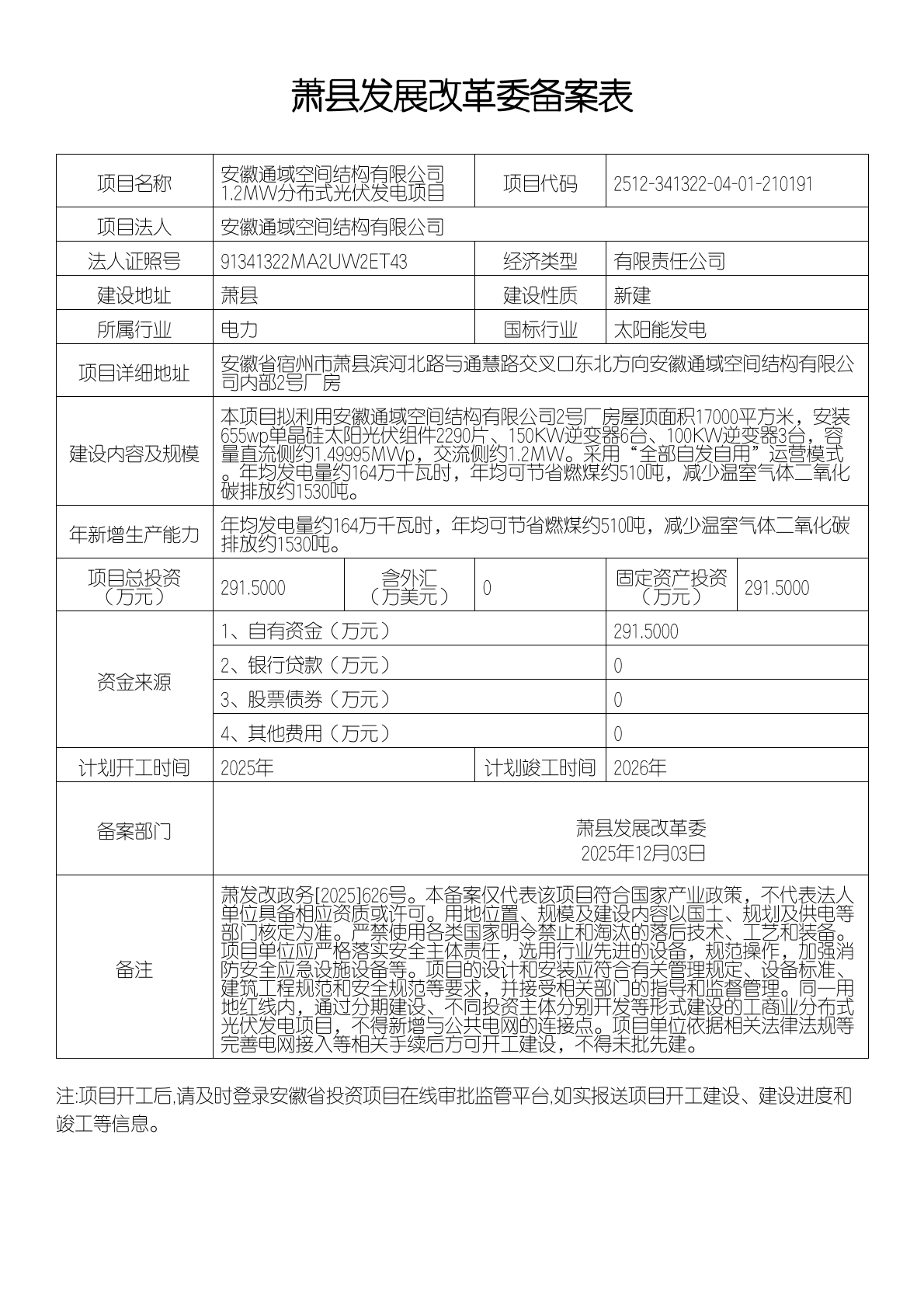 安徽通域空间结构有限公司1.2MW分布式光伏发电项目2025.12.3