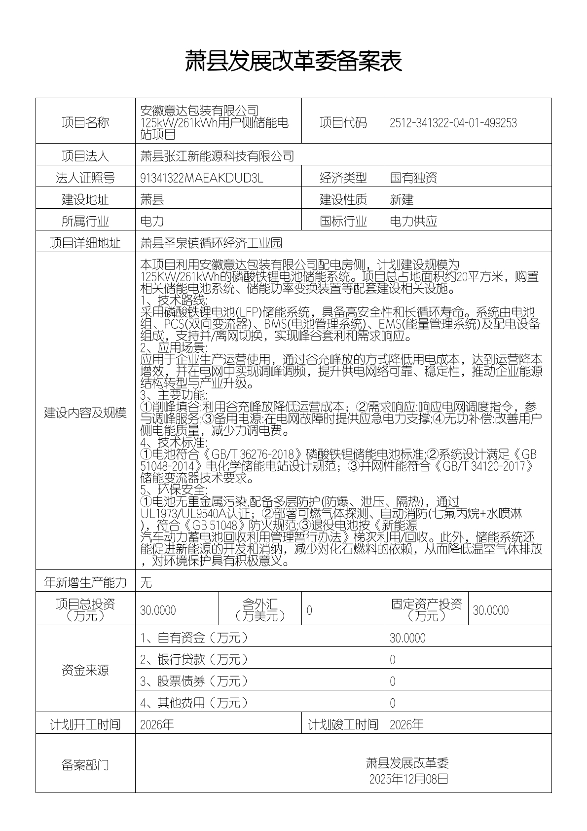 萧县张江新能源科技有限公司安徽意达包装有限公司125kW_261kWh用户侧储能电站项目2025.12.8