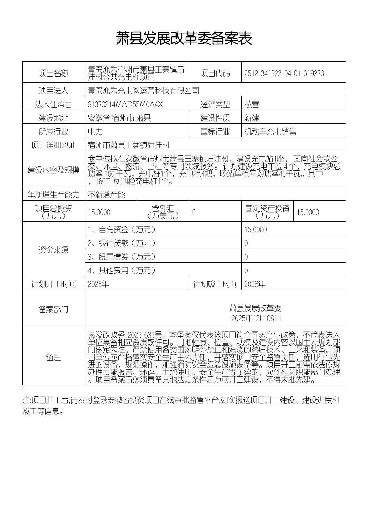 635号青岛亦为宿州市萧县王寨镇后洼村公共充电桩项目2025.12.8