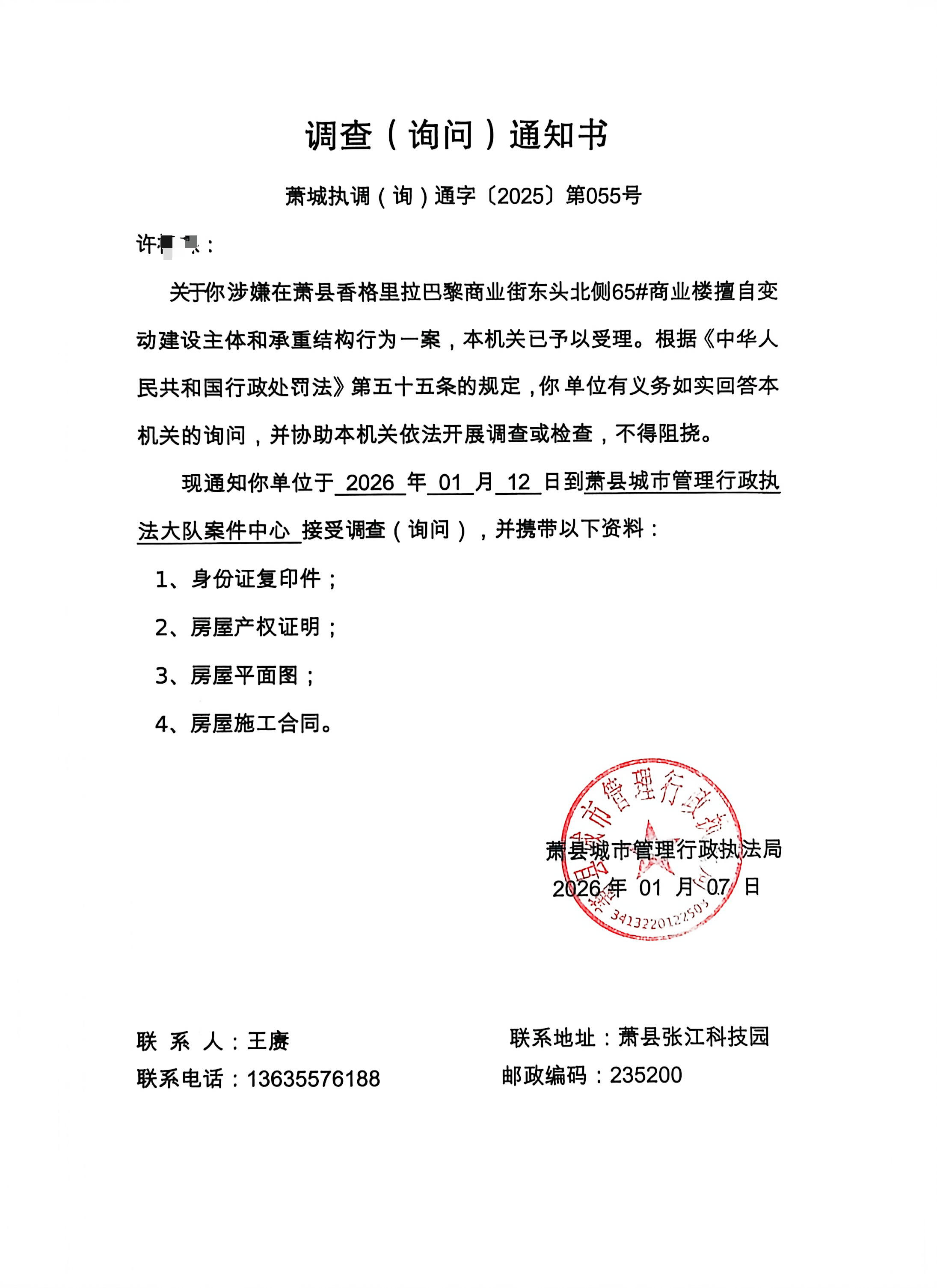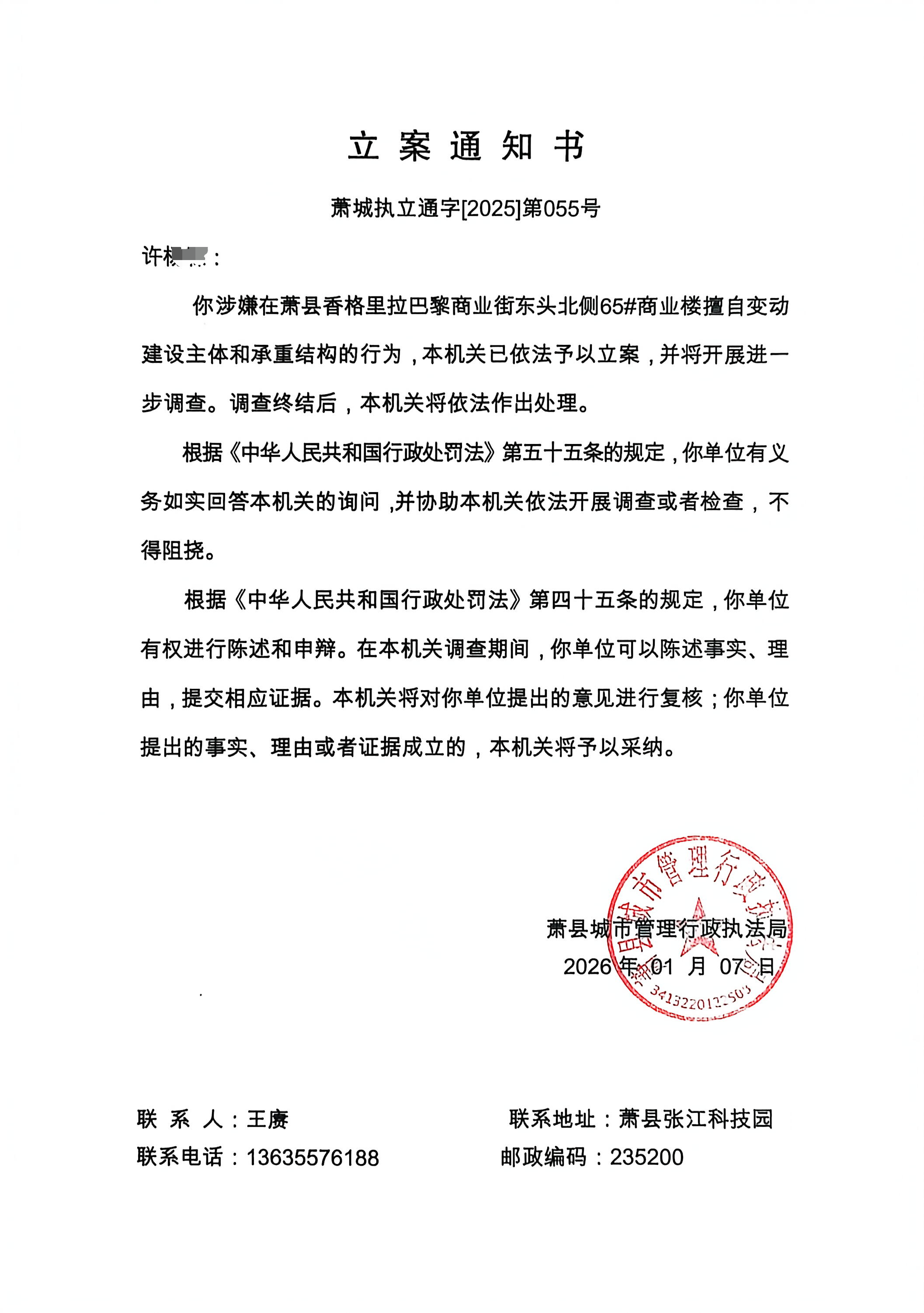 萧县城市管理局2026年1月工程建设管理送达(公示)
