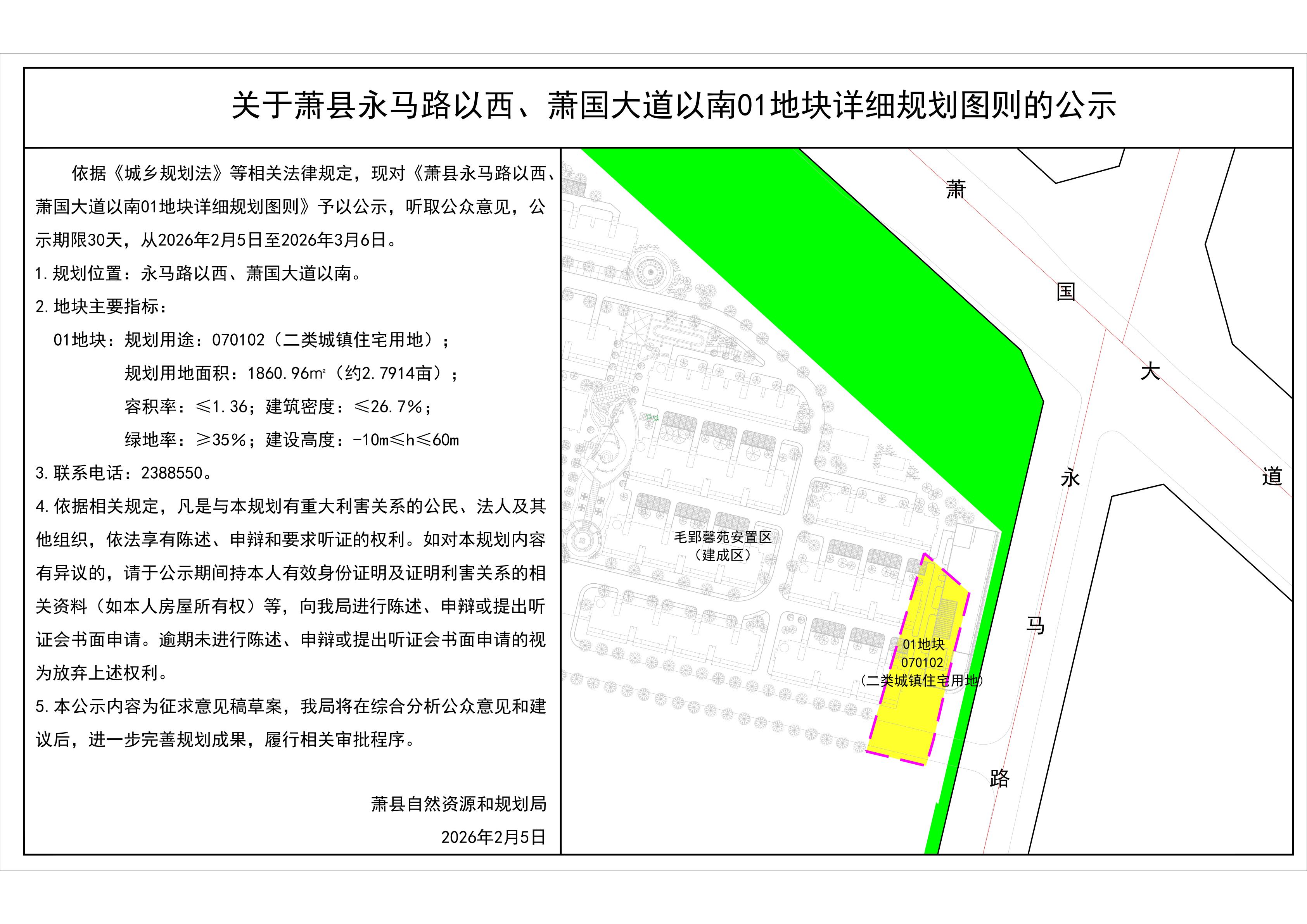 关于萧县永马路以西、萧国大道以南01地块详细规划图则的公示