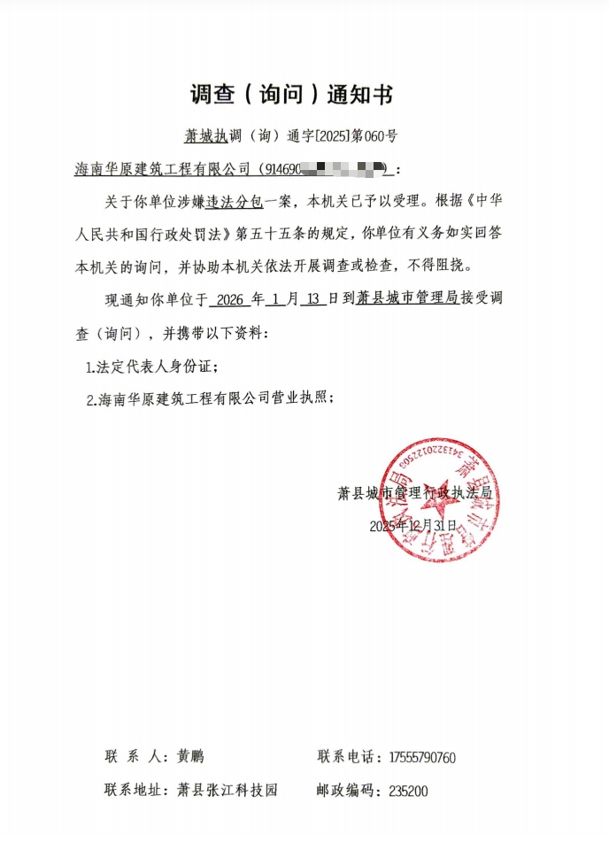 萧县城市管理局2026年工程建设管理立案通知书、调查(询问)通知书送达公示