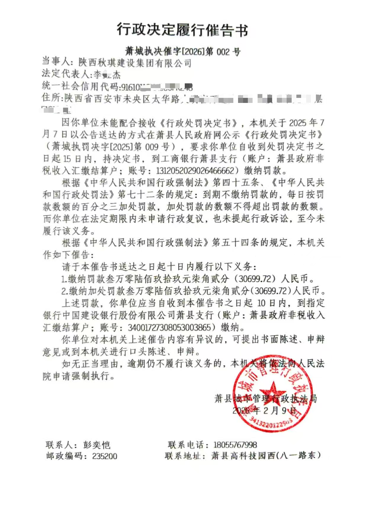 萧县城市管理局2026年工程招标投标管理行政决定履行催告书(送达)公示(二)