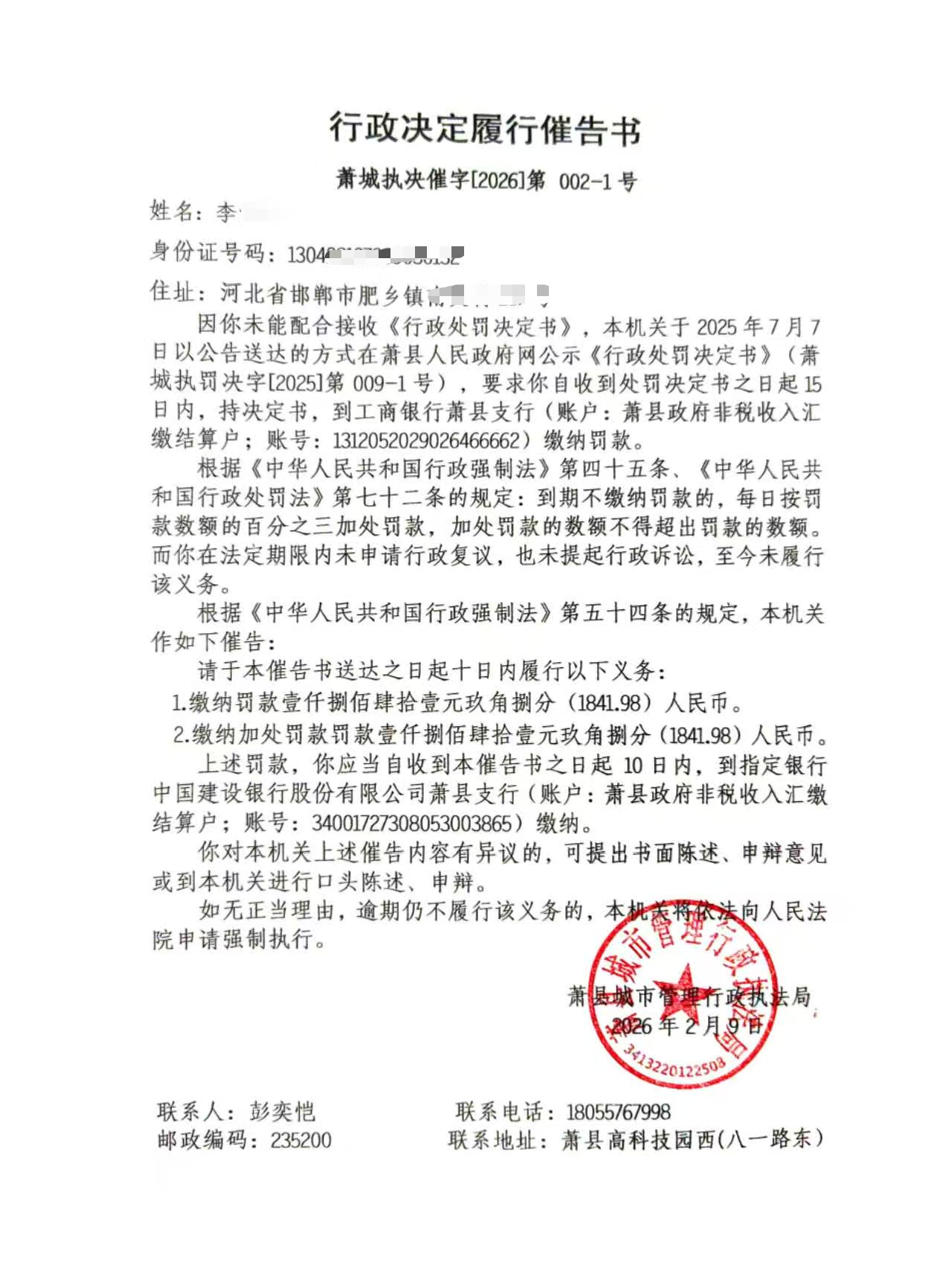 萧城执决催字[2026]第002、002-1号