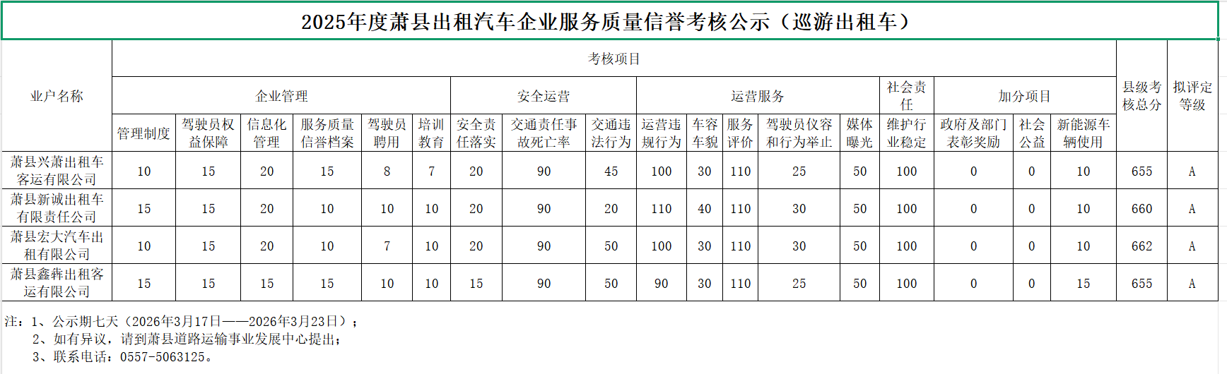 2025年度萧县出租汽车企业服务质量信誉考核公示(巡游出租车)