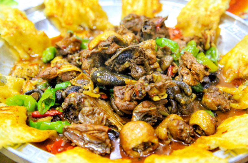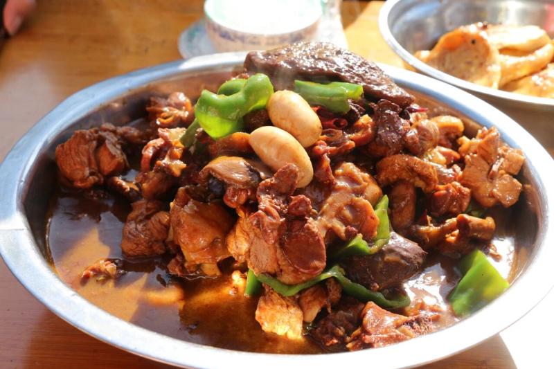 皇藏峪蘑菇鸡,是萧县的特色美食,由皇藏峪野生蘑菇和本地土公鸡烧制而成,生姜、辣椒用量较大,盛具用大脸盆,味美鲜嫩,吃后回味无穷,周围市、县慕名驱车前来品尝者络绎不绝。现有“看皇藏峪原始森林,品天下第一美味”之胜名。
