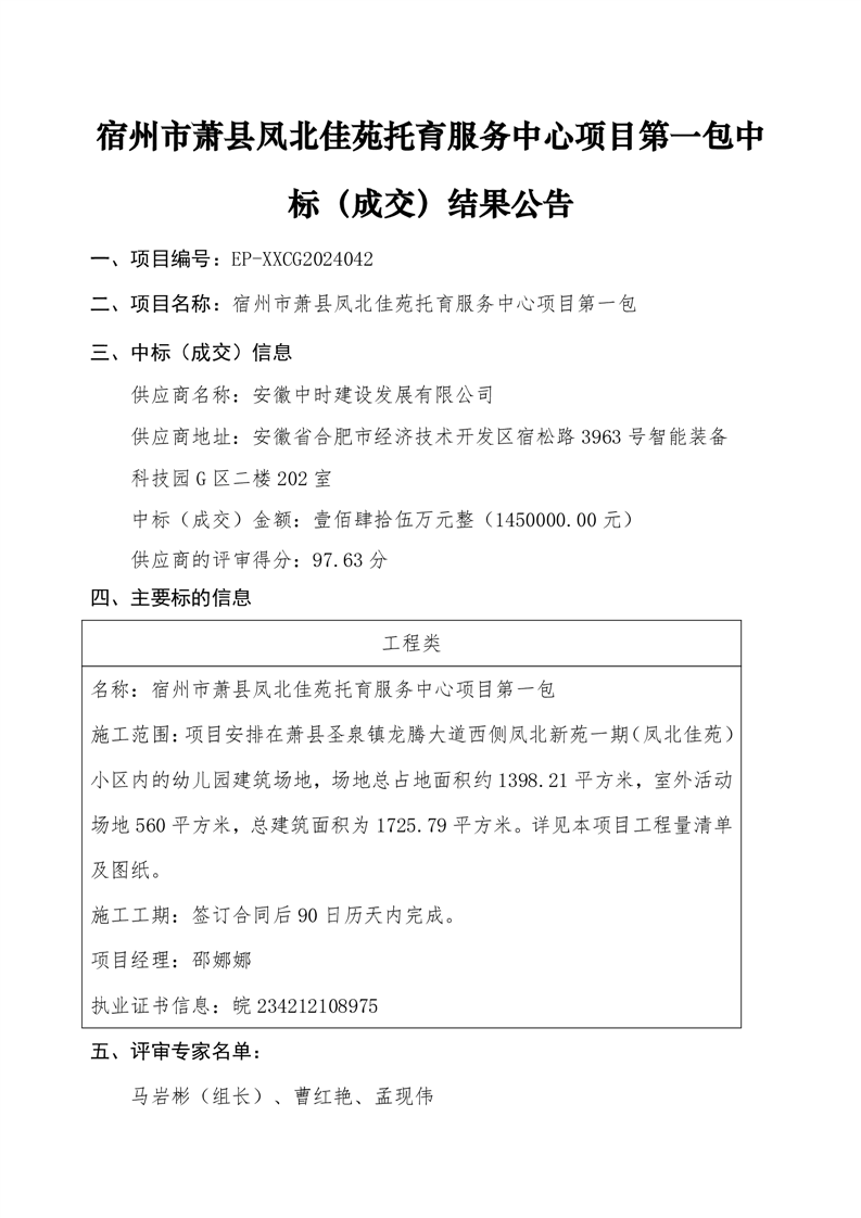 【中标结果】宿州市萧县凤北佳苑托育服务中心项目第一包中标(成交)结果公告 |