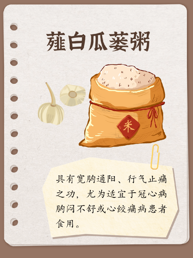 做法:准备薤白10g,瓜蒌壳10g,粳米适量。先将薤白、瓜蒌、粳米淘洗干净,粳米入锅慢煮,待熬至米烂粥稠,加入薤白、瓜蒌壳熬煮10分钟,最后加盐调味即可出锅。