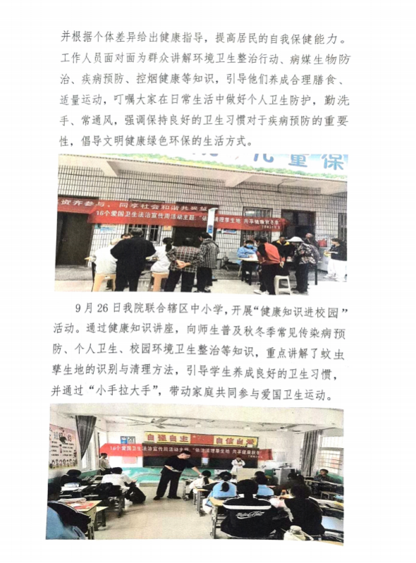 (二)普及健康知识。通过网站、新媒体、健康教育栏、开学第一课等形式,积极开展健康教育,广泛宣传基孔肯雅热、登革热、感染性腹泻、呼吸道感染等季节性传染病的防控知识。县卫健委在城区农贸市场、社区、广场、公厕等处设置健康宣传栏(展板)350余块。全县各级医疗卫生健康单位通过组织社区宣讲、科普视频、健康讲座等形式,引导群众践行“勤洗手、多通风、用公筷”等文明卫生习惯,倡导合理膳食,全民健身活动,增强群众“自身健康第一责任人”的意识,自觉践行文明健康绿色环保的生活方式,促进了居民健康素养水平进一步提升。