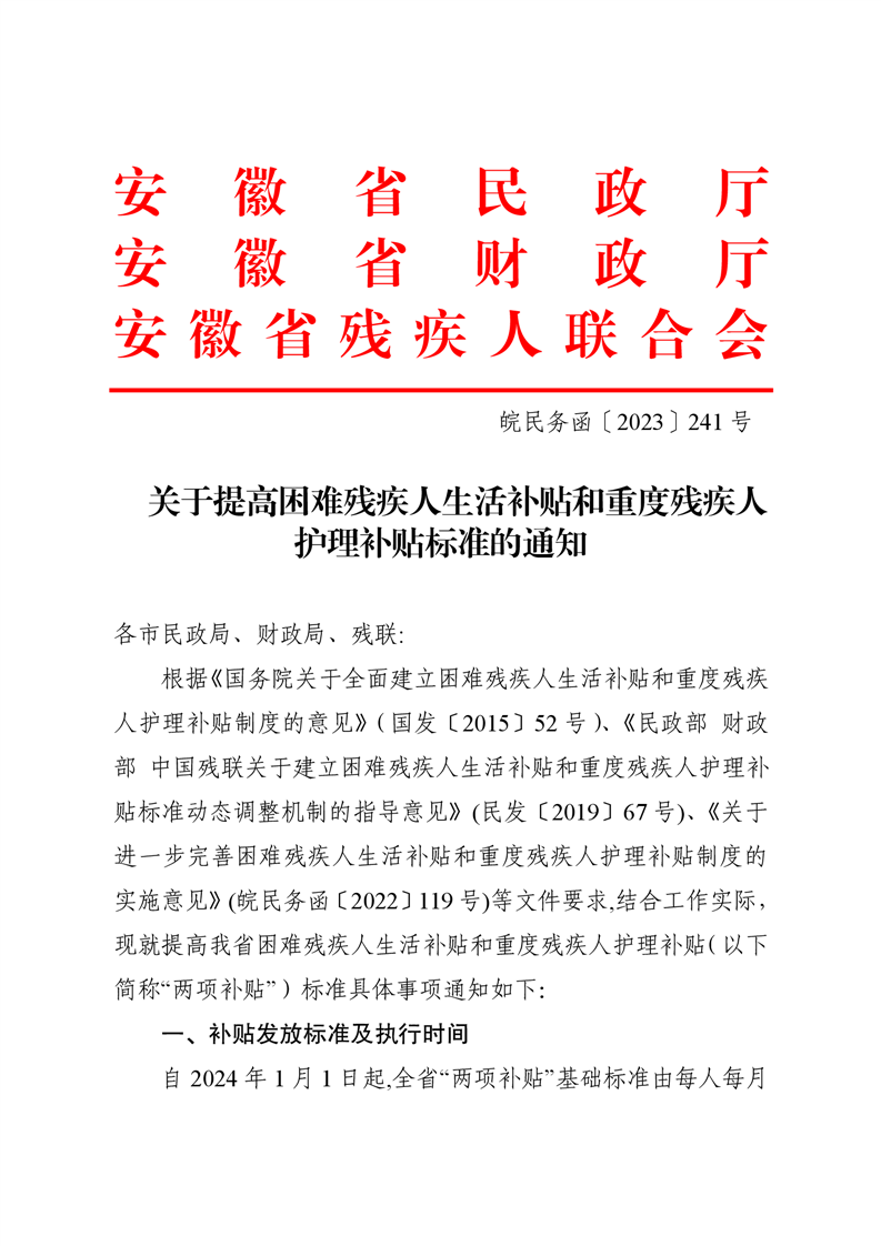【政策文件】关于提高困难残疾人生活补贴和重度残疾人护理补贴标准的通知【2023】241号