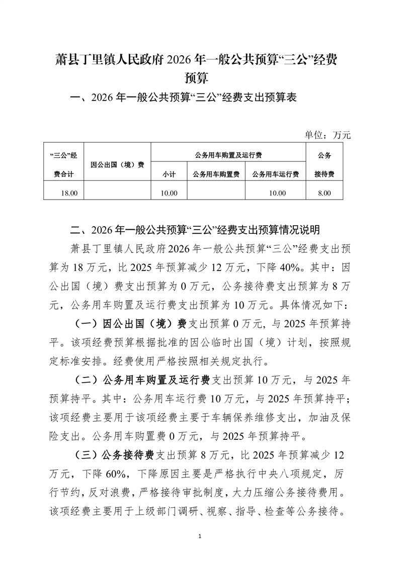 萧县丁里镇人民政府2026年一般公共预算“三公”经费预算