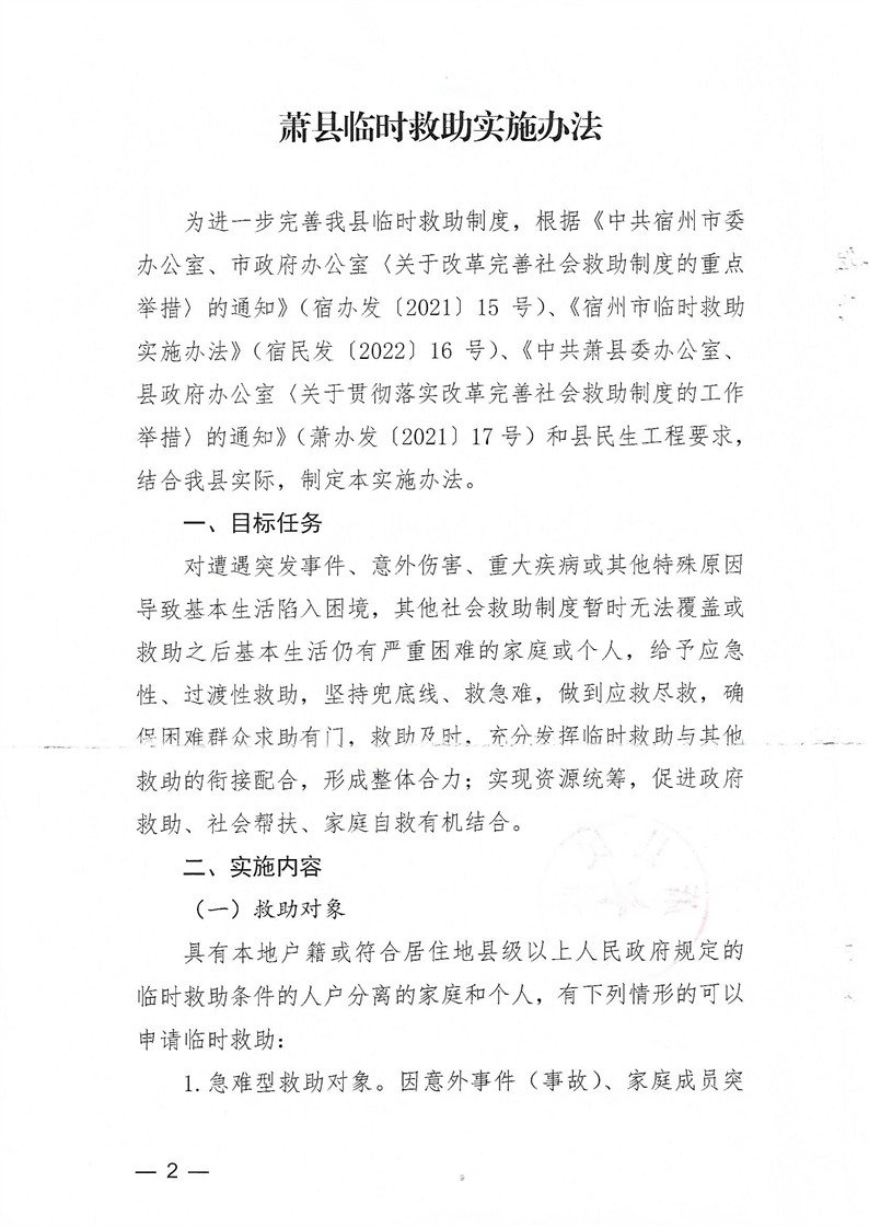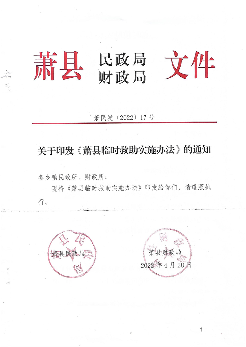 【政策文件】关于印发《萧县临时救助实施办法》的通知(萧民发【2022】17号)