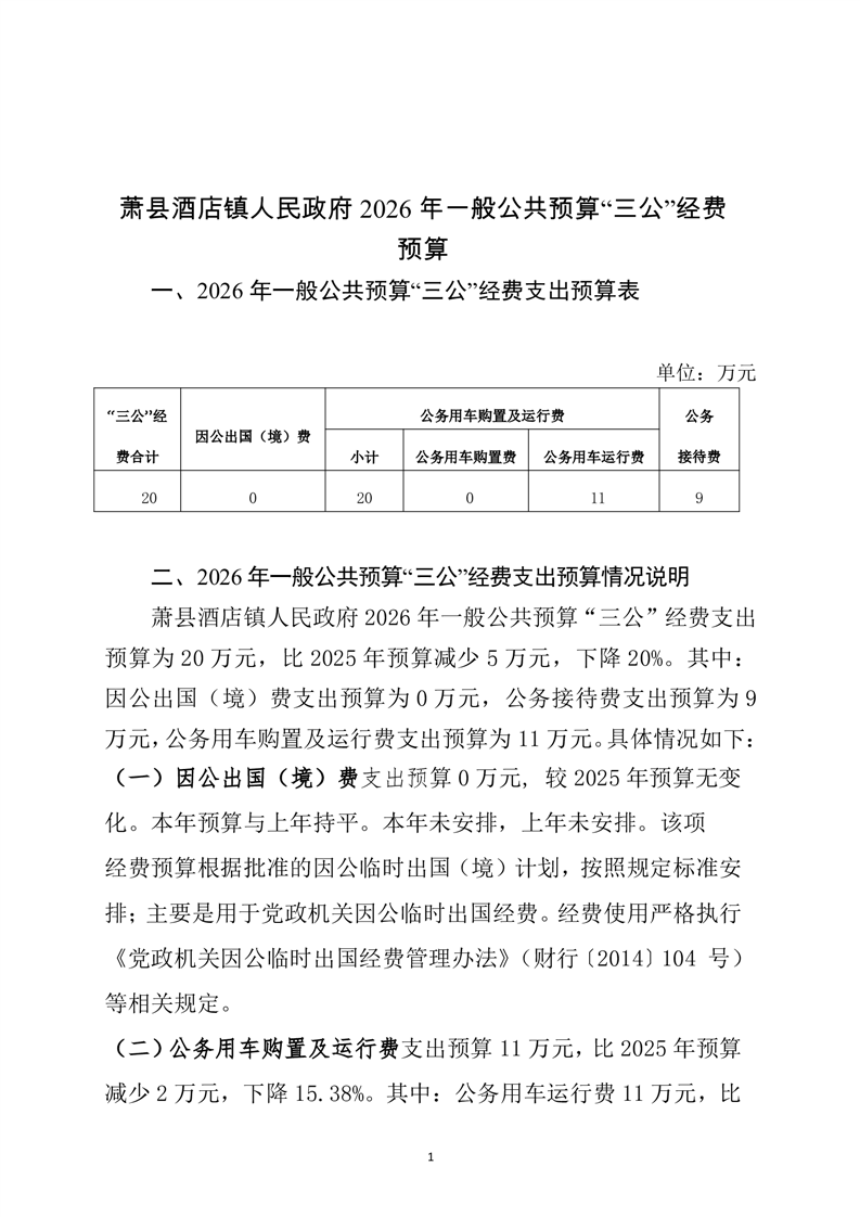 关于萧县酒店镇人民政府2026年一般公共预算“三公”经费预算