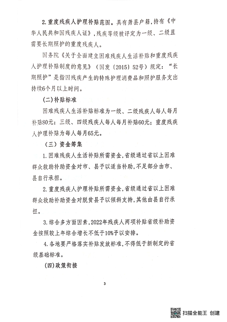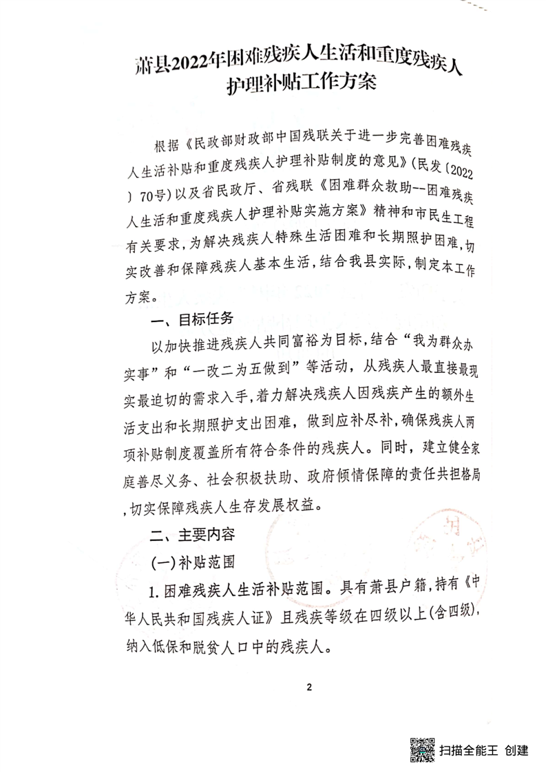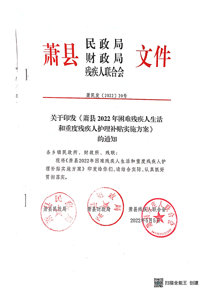 【政策文件】关于印发《萧县2022年困难残疾人生活和重度残疾人护理补贴实施方案》的通知(萧民发【2022】20号)