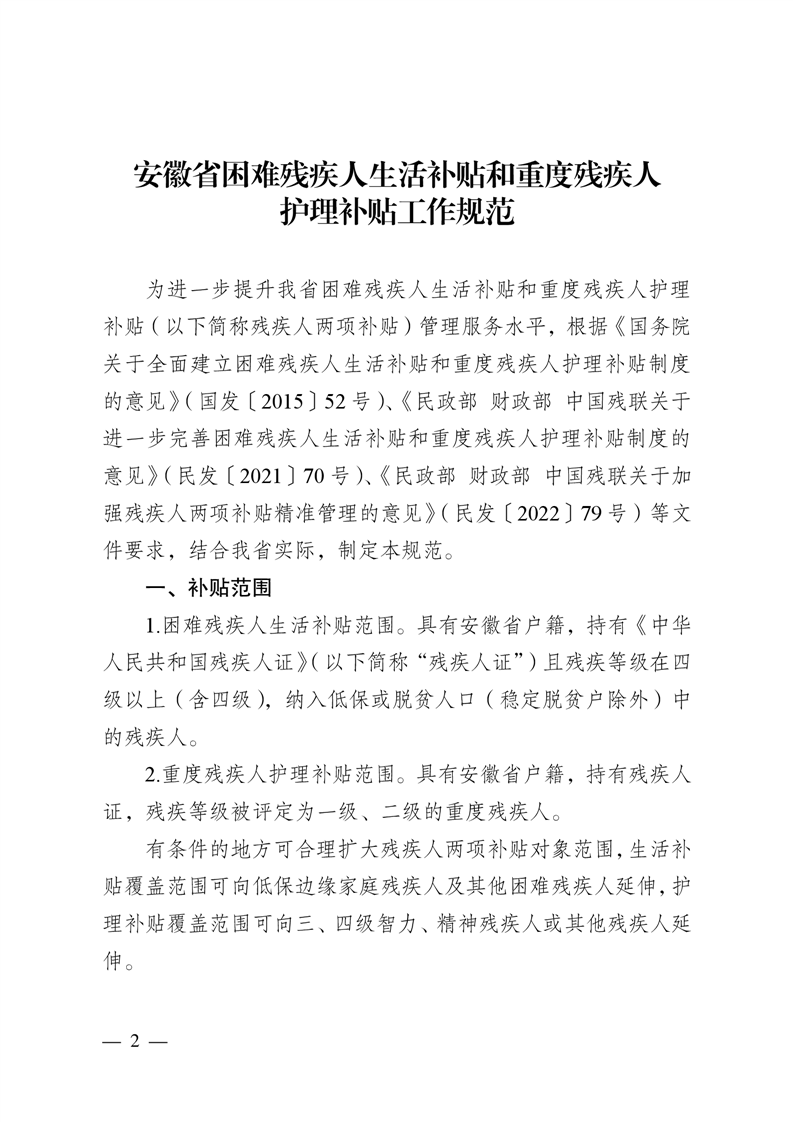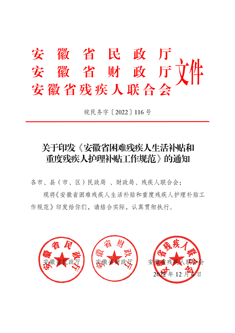 【政策文件】关于印发《安徽省困难残疾人生活补贴和重度残疾人护理补贴工作规范》的通知(皖民务字【2022】116号)