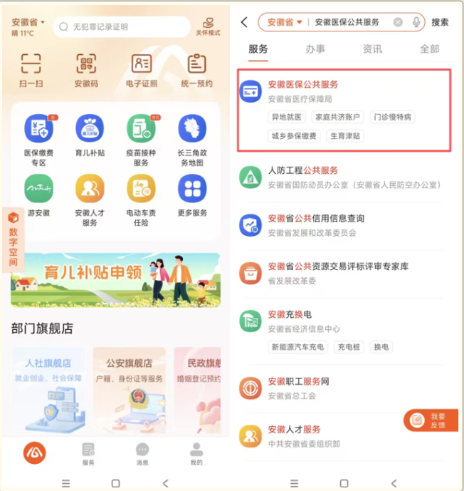 1.下载注册并登录“皖事通”APP,在首页搜索“安徽医保公共服务”,点击进入。