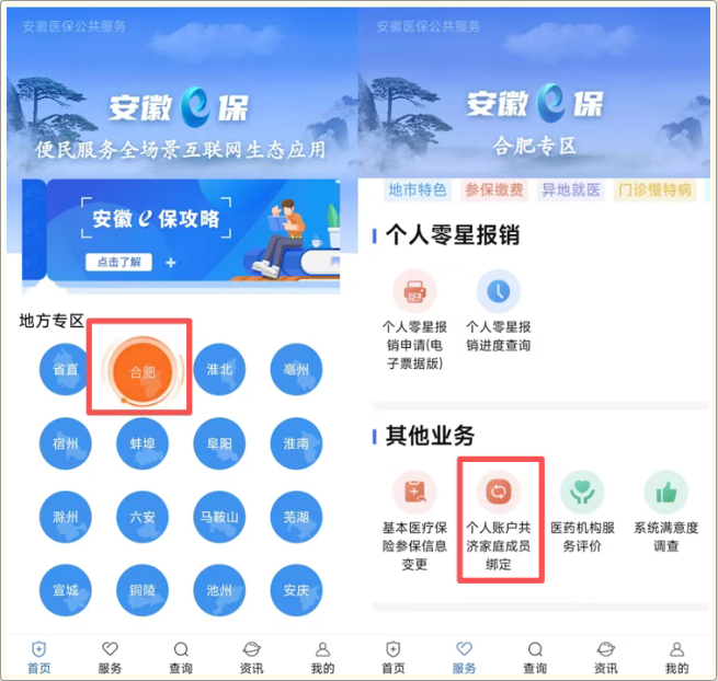 2.选择医保所在的区域,这里以“合肥”为例,在服务版块中找到“个人账户共济家庭成员绑定”服务,点击进入。