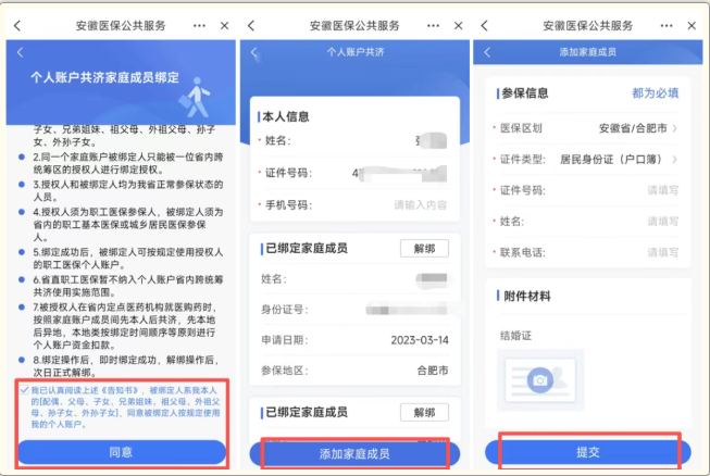 3.阅读绑定告知书后,点击同意进入。选择“添加家庭成员”,按照要求填写信息、提交材料后点击“提交”,即可完成绑定。