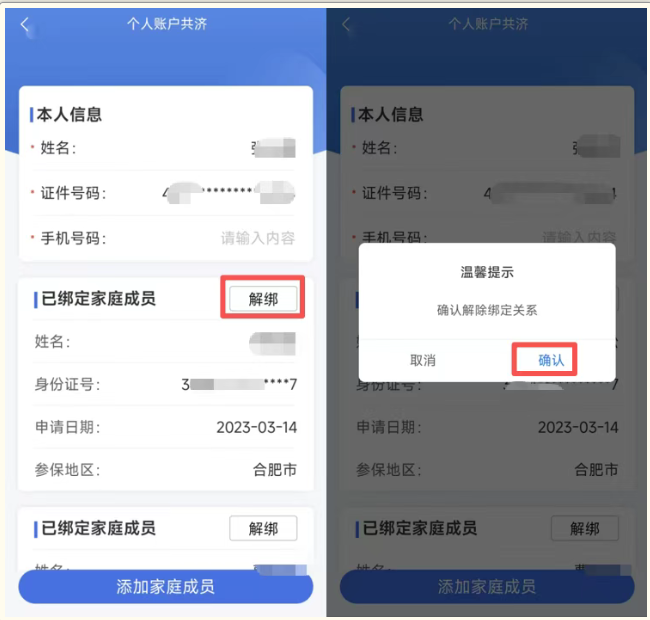 个人账号共济家庭成员绑定成功后