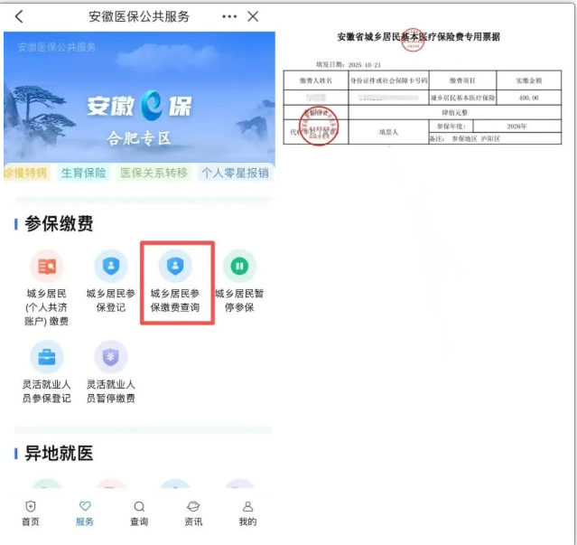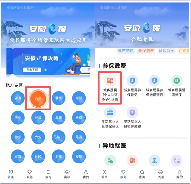进入安徽医保公共服务平台,选择你所在的区域,这里以“合肥”为例,在“服务”页面找到“参保缴费”版块,选择“城乡居民(个人共济)缴费”服务。