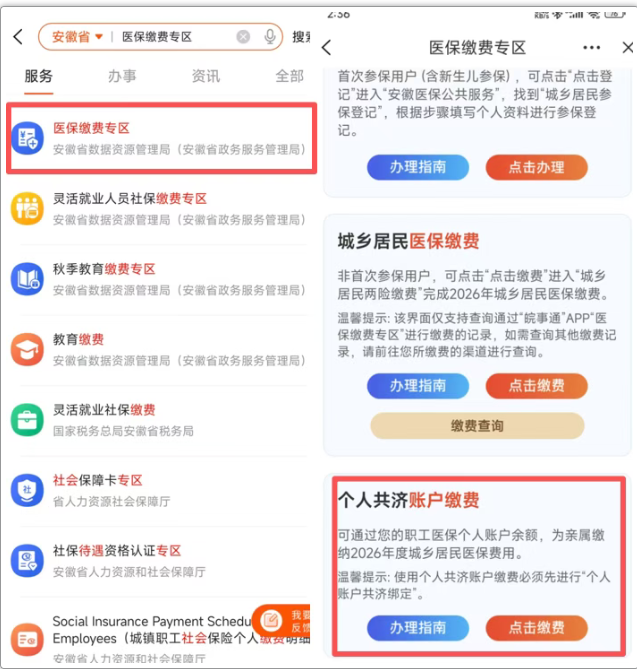 首页搜索“医保缴费专区”服务,点击进入。找到“个人共济账户缴费”版块,选择“点击缴费”进行缴费。