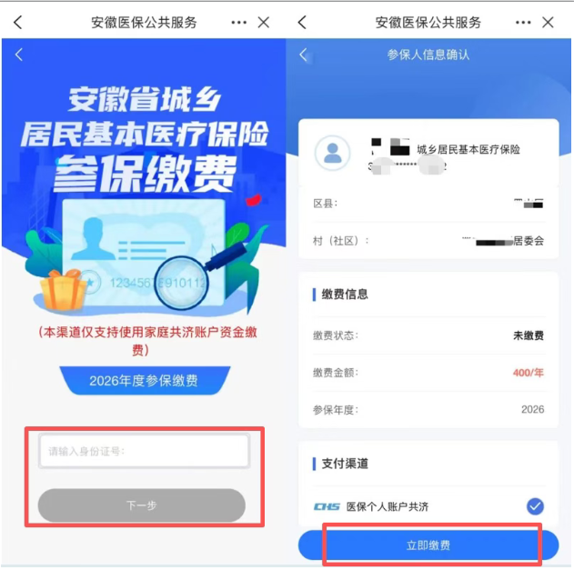 在服务页面输入参保人的身份证号后点击“下一步”,确认参保人信息,在支付渠道选择“医保个人账户共济”,最后点击“立即缴费”即可。