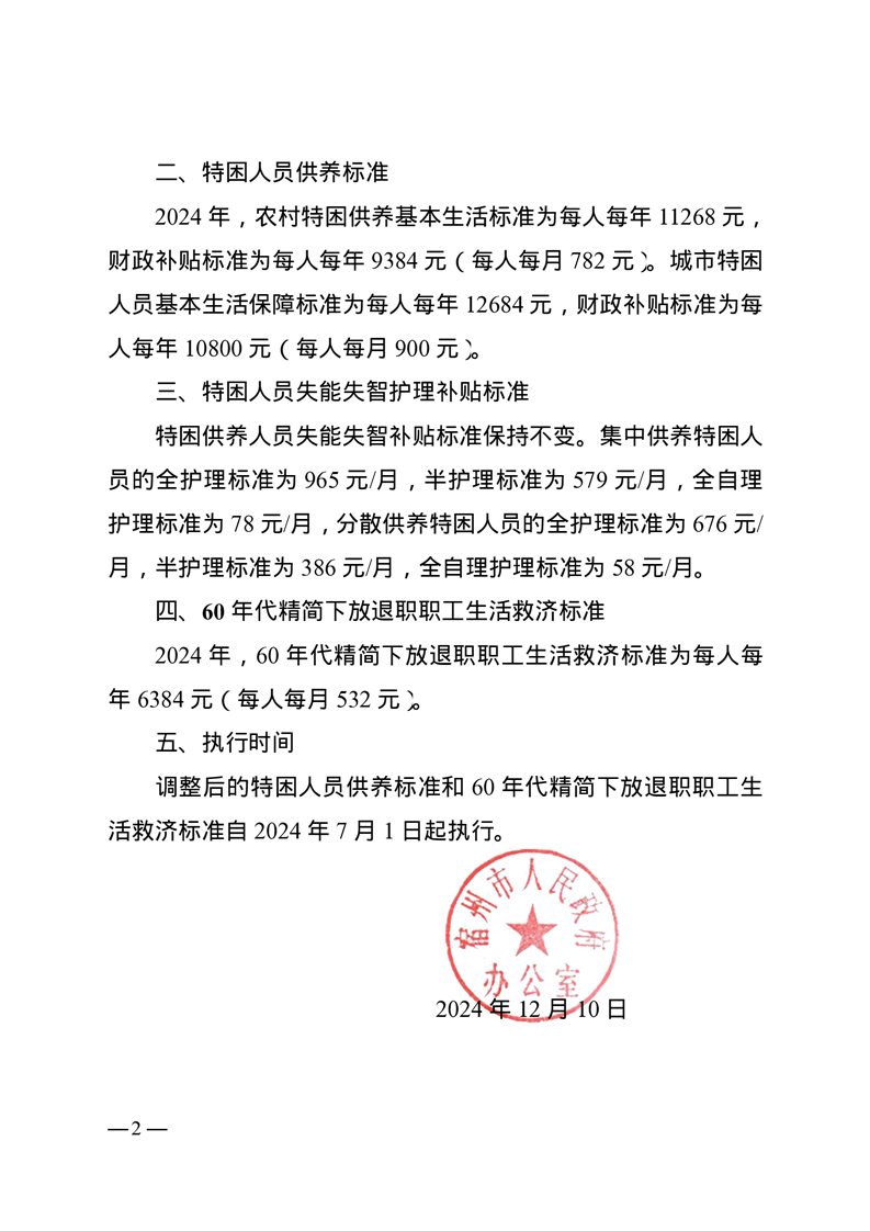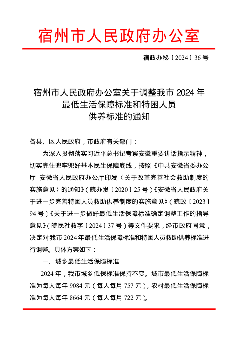 【政策文件】宿州市人民政府办公室关于调整我市2023年最低生活保障标准和特困人员供养标准的通知(宿政办秘〔2024〕36号)