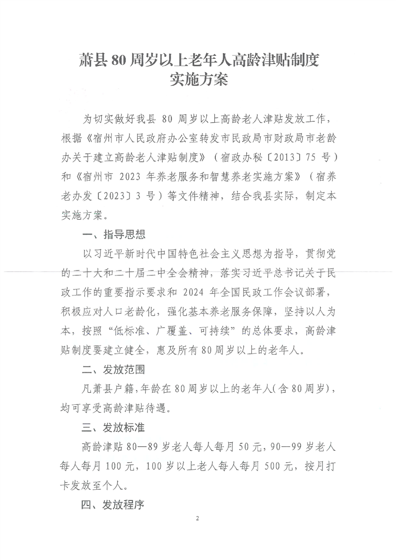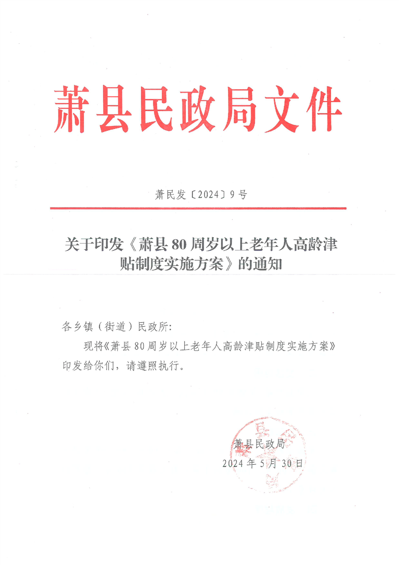 【政策文件】关于印发《萧县80周岁以上老年人高龄津贴制度实施方案》的通知(萧民发〔2024〕9号)
