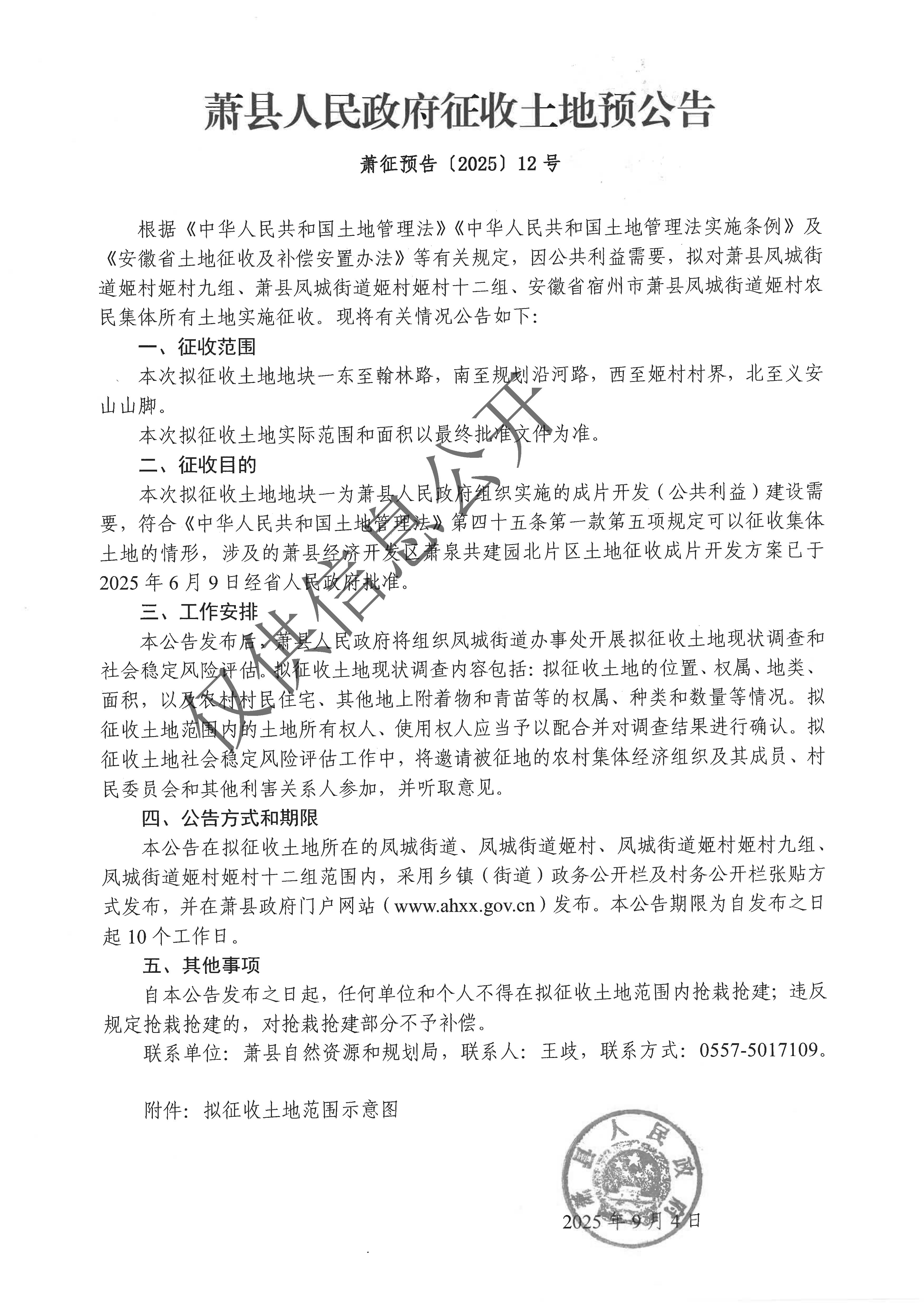 萧县人民政府征收土地预公告萧征预告(2025)12号