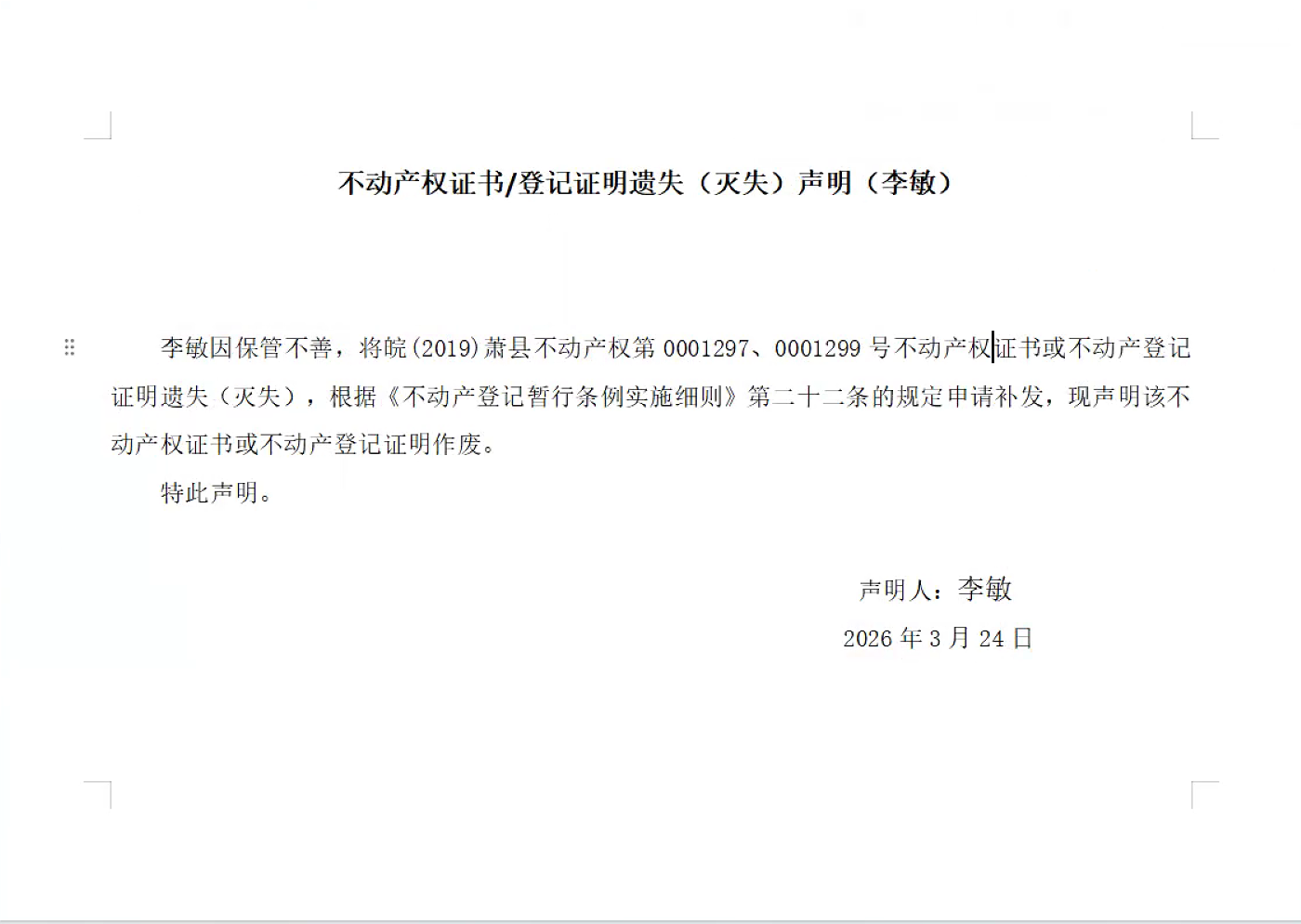不动产权证书/登记证明遗失(灭失)声明(李敏) |