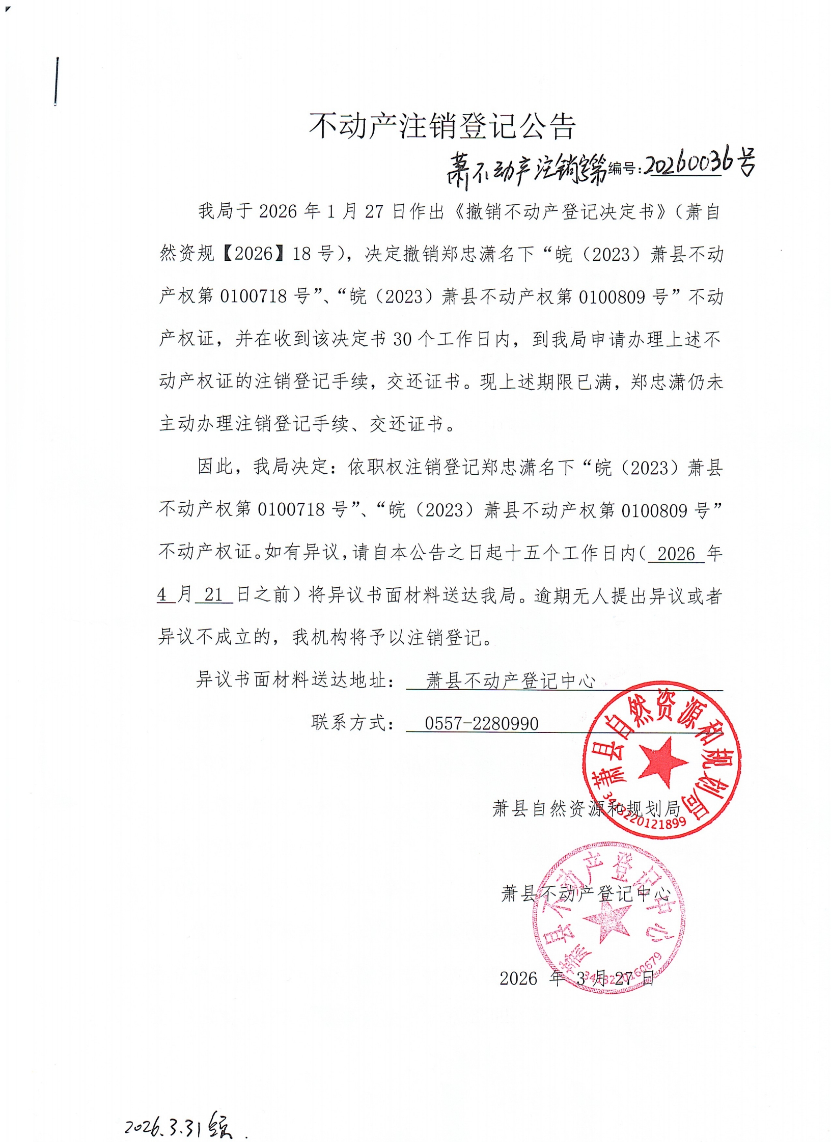 萧不动产注销字第20260036号