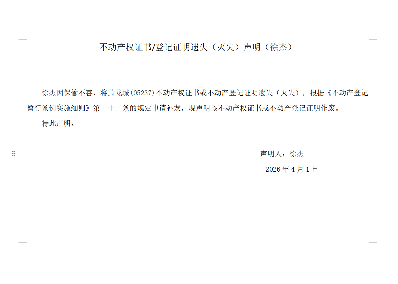 不动产权证书/登记证明遗失(灭失)声明(徐杰) |