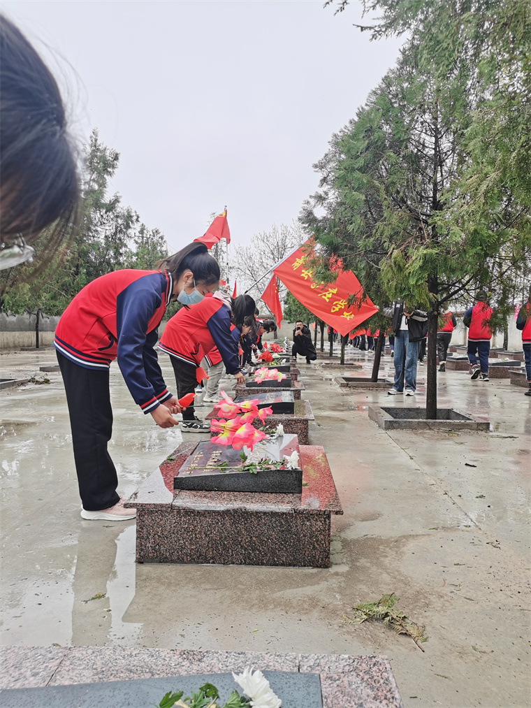 深灰色的陵园门楼庄严肃穆,师生代表先后向长眠在这里的400余名革命烈士默哀、敬献鲜花,并擦拭墓碑上的灰尘。在烈士墓前,学校优秀共产党员向学生们讲述了先烈们的英雄事迹,同学们庄严肃立,神情庄重。