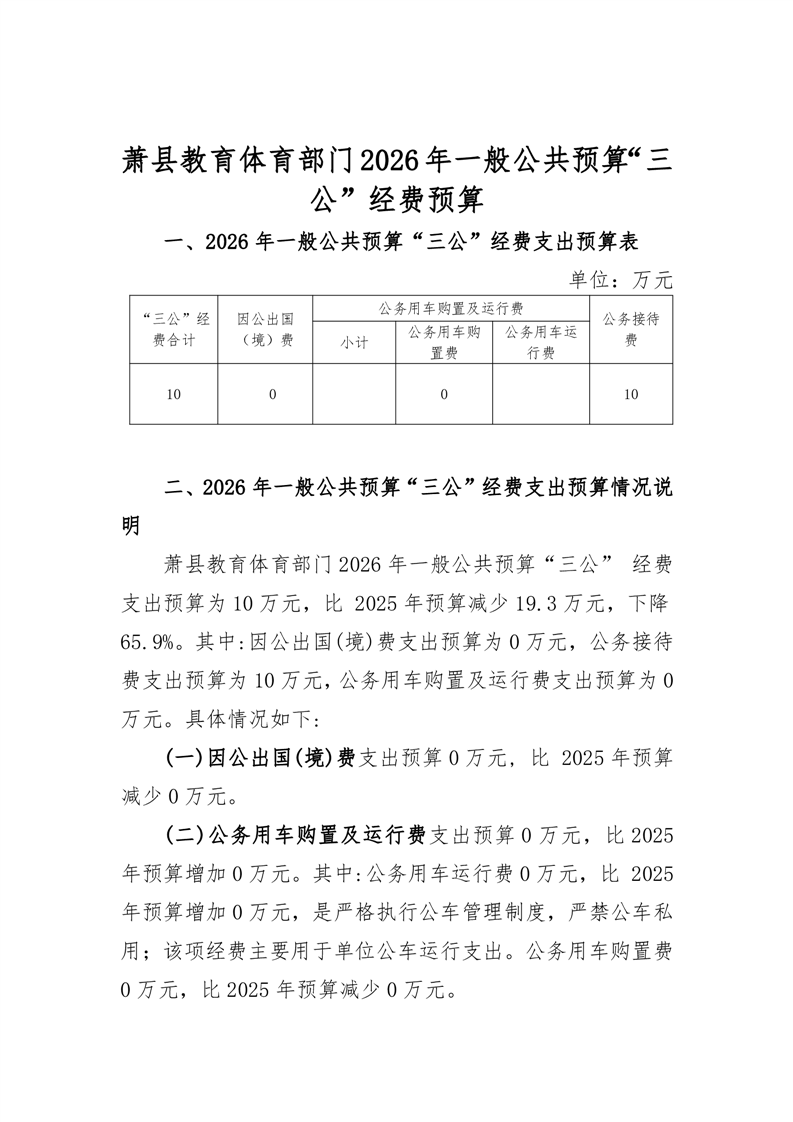 萧县教育体育局2026年一般公共预算“三公”经费预算公开